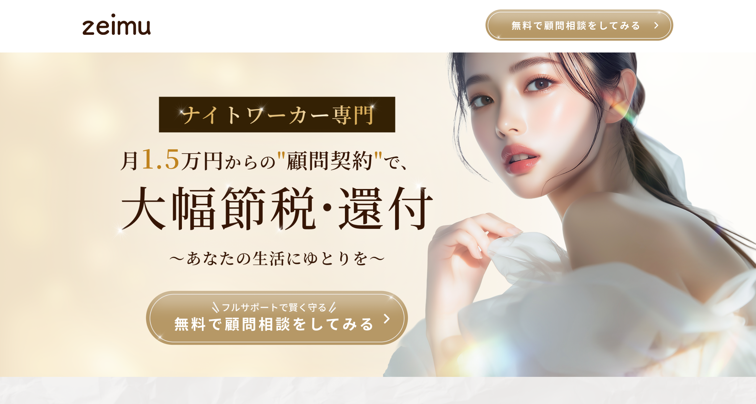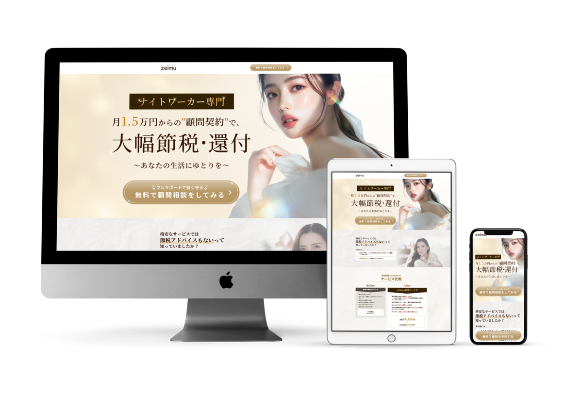 夜の業界で働く方に特化した税務相談サービスのランディングページ。HTMLコーディングからJavaScriptによる動的機能まで、LP制作全般を担当した。